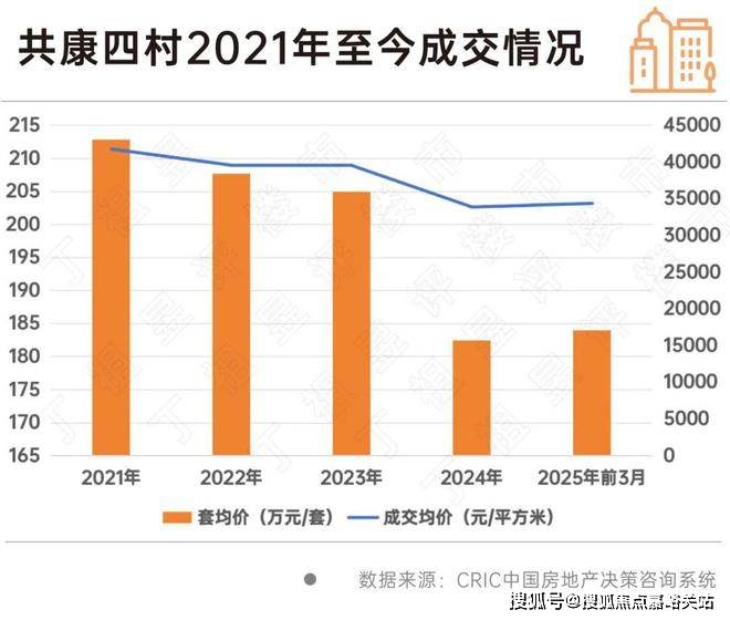 CRIC数据显示,2021年至今共康四村成交均价从41782元/平方米跌至34386元/平方米,跌幅达17.7%,套均总价从212.89万元/套跌至184.04万元/套。