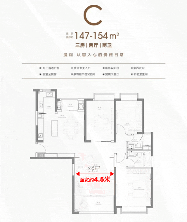 2、超尺度空间,居住体验拉满:对比市面上150㎡左右四房,客厅面宽普遍仅4米,主卧开间约3.6米,北向房间甚至只能作书房使用。