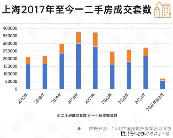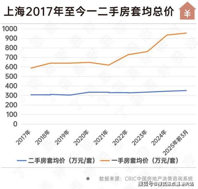 CRIC数据显示,2017年至今,上海一二手房成交套数的比值一直在1:3左右,也就是说每卖1套一手房就有3套二手房成交。从成交套数来看,二手房占据绝大多数。与此同时,虽然一手房经常出现较高成交价格,但上海二手房套均总价一直在300多万元/套,2025年一季度上海二手房套均总价为352.56万元/套。